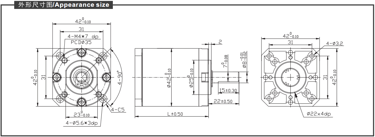 輸出軸直徑為Φ8.0mm,長度可根據(jù)客戶要求定制