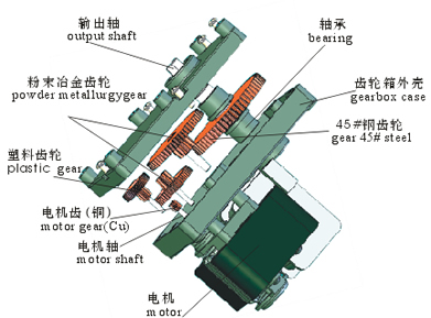 根據(jù)每檔齒輪受力大小,計(jì)算出齒輪的模數(shù)、厚度和材料,并經(jīng)過壽命測(cè)試,這樣才能做出更低噪音并足夠壽命的有機(jī)結(jié)合。電機(jī)有直流電機(jī)、無刷直流電機(jī)、罩極電機(jī)等可組合。
